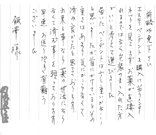拝啓、先日はエスティペンダントをありがとうございました。2年前に突然、病気に襲われ本当に困惑しました。でも現在はそんな事があったかというぐらいに元気に仕事をしています。